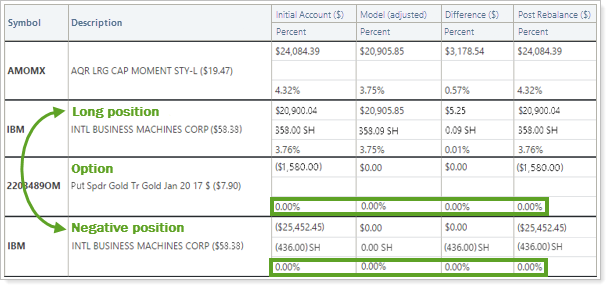 Positions in a client's account that have a negative value; examples include short positions and options. On the Rebalance Summary and other reporting, negative value positions appear on a different line from any long positions with the same ticker.