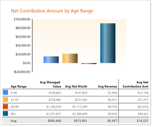 This chart graphic is showing Average Net Contribution Amount (Series/Y axis) by Age Range (Category/X axis). The chart breakdown is showing, by Age Range, calculations of each of the columns with a final total that should match with the information in the fields in the top portion of the report. The only difference being Average Net Contribution Amount showing a dollar amount based on Contributions showing on Financial Accounts underlying the Household Account, which is integrated from Reporting.