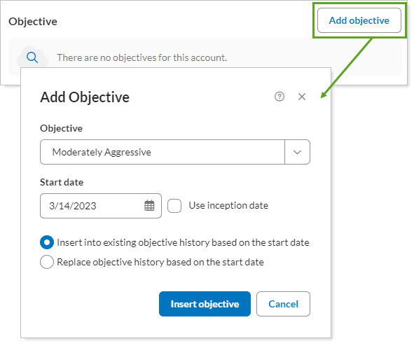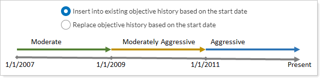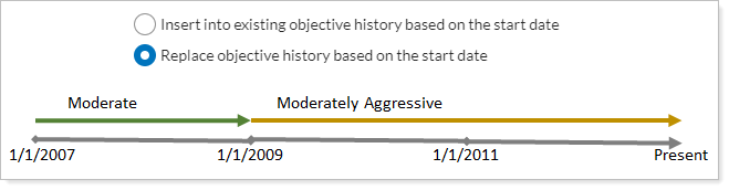 Selecting the Insert into existing objective history based on the start date check box inserts the Moderately Aggressive objective into the objective history starting at the start date entered for the Moderately Aggressive objective and ending at the start date for the Aggressive objective.