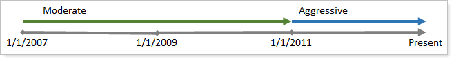 Kelly realizes that there was a period starting on 1/1/2009 where the account actually had a Moderately Aggressive objective before it changed to Aggressive on 1/1/2011.