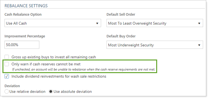 Selected. Tamarac Trading only warns the user during a rebalance if cash reserves cannot be met.