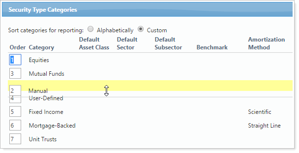 This setting allows you to reorder a list within Tamarac Reporting. To reorder, drag and drop into the desired location or type the desired order in the Order box.