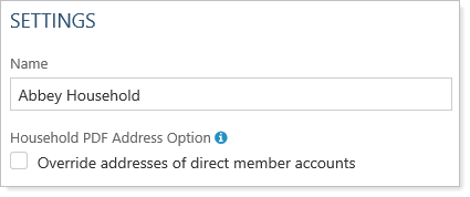For example, a firm has a Household representing a non-investor relationship with a CPA, and the Household had been assigned multiple member accounts. It makes more sense for the CPA's business address to appear on the PDF reports rather than the account's address—which is likely the investor's address. Doing this preserves the investor addresses on the underlying accounts, but when PDF reports are created for the CPA firm, the firm's business address will appear on all reports.