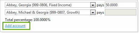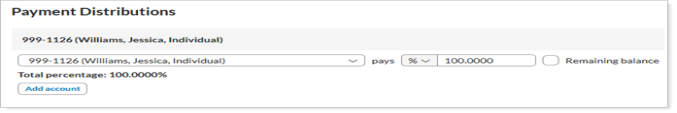 From the list, choose the account or accounts responsible for paying the account balance. Payments can be distributed across accounts based on a dollar amount, percentage, or the remaining unpaid balance. You can specify up to four decimal places for the percentage.