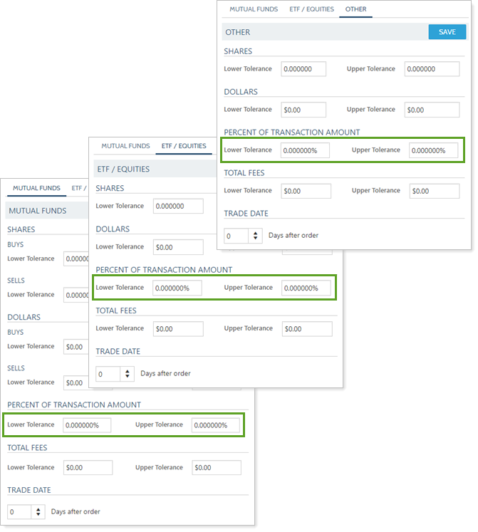 Leave all Shares and Dollars fields at 0, your Percent of Transaction Amount fields as 0, and use $1 for Total Fees tolerances. This ensures that those transactions that are truly accurate will auto-reconcile. If problems arise in future reconciliation, you can identify them early and adjust accordingly.