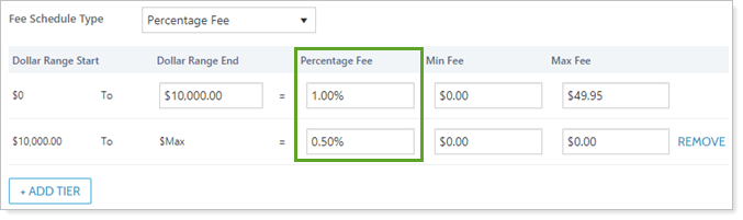 If the percentage fee has tiers—for example, the custodian charges a 1% fee for transactions up to $10,000 and a 0.5% fee for transactions over $10,000—the Add Tier button will reveal additional Percentage Fee, Min Fee, and Max Fee fields so you can establish the tiered fee.