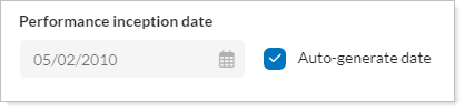 When you select the Auto generate date check box, Tamarac Reporting will set the performance inception date to the day before the first transaction. If you'd prefer a different date, such as the day of the first transactions (or any day after the first transaction), you can type a date in the Performance Inception Date box.