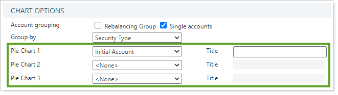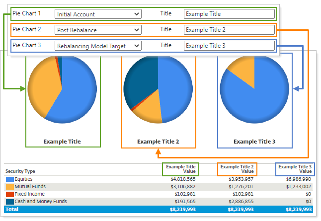 The Pie Chart 1, Pie Chart 2, and Pie Chart 3 settings control three available pie charts n the Rebalance Summary Charts PDF report by letting you choose what kind of data you want to show for that pie chart. With three available pie charts, you can compare data side by side.