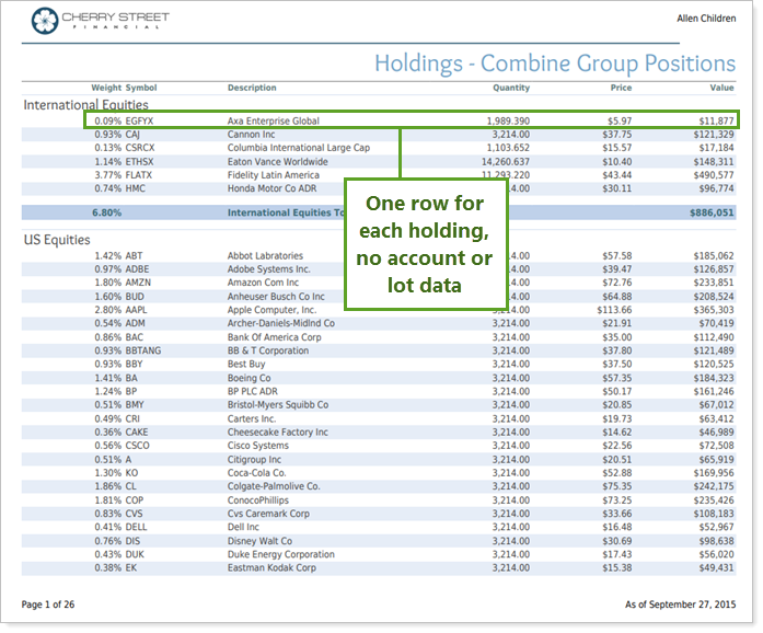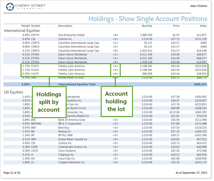 Choose Show single account positions to split the holdings for each security by account. The report adds a row for every account holding each security. This option can produce a long report section, depending on the number of accounts and holdings.