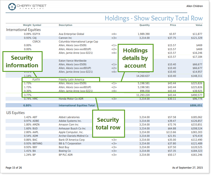 Choose Show security total row to split the holdings for each security by account, with an additional row that summarizes the total details for that holding. This allows you to include both information about which accounts hold what, and the overall holding values. This option can produce a very long report section, depending on the number of accounts and holdings.