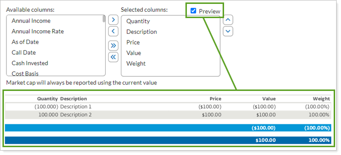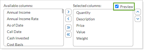 To see the preview, select Preview. Preview updates live as you add columns to Selected columns.