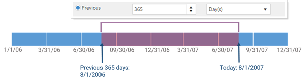 For example, today is 8/1/2007 and you want to see a date range from 365 days ago to current time, you would use this date period, set to 365 days, to see from 8/1/2006 to 8/1/2007.