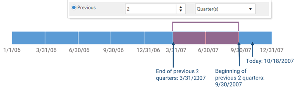 Previous quarter, month, and year dates begin on the prior quarter, month, or year end. For example, if today is October 18, 2007 and you use Previous 2 Quarters, the date period begins on 9/30/2007 and ends 3/31/2007.