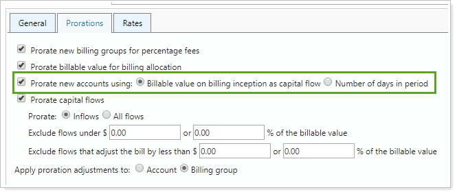 To calculate the new accounts adjustment by applying a proration based on capital flows adjusted by number of days, choose Billing inception value as capital flow.