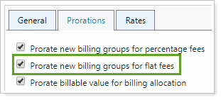 This setting allows you to prorate the flat fees on the bill for the period of time which the first account within the billing group was open and funded. To see this option, select Include flat fees on the General tab.