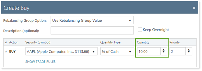 When creating or editing a directed trade, Quantity lets you specify the quantity you want to trade. This setting goes hand-in-hand with Quantity Type. For example, if you create a directed trade to buy AAPL using % of Cash as the Quantity Type, Quantity will be the percent of cash in the account you use to buy AAPL.