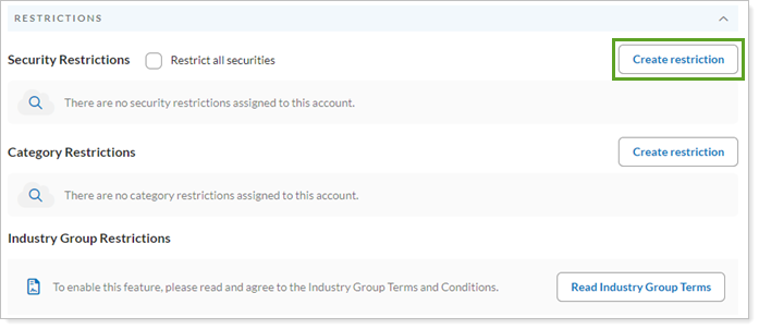 Security restrictions at the account level, found on the Rebalance & Trade Settings panel, let you restrict a security's trading activity, such as restricting buys and sells, at the account level rather than the global level. You can access these settings by selecting Create Restriction.
