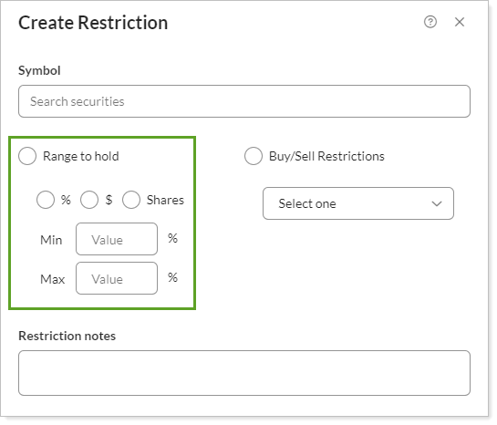 Range to Hold lets you define the lower and upper amounts you would like to hold in the security. You can define these amounts in either dollars, percentage of account, or number of shares.