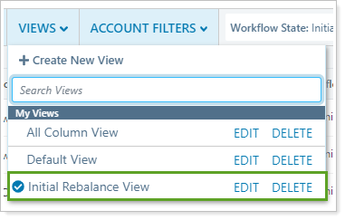 For more information about views on the Rebalance page, see Review Trades With the Rebalance Page, Rebalance Page Actions, Views, and Filters, and Using Page Views.