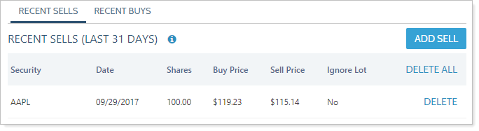 The Recent Sells tab shows securities sold at a loss within the last 31 days, while the Recent Buys tab shows securities purchased in the last 31 days in a taxable account that holds at least one other lot of that security at a loss. This 31 day period is considered today plus the last 30 days. You will see recent trades on these tabs if at least one account in the same Wash Sale Group ID is a taxable account.