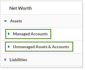 For more information about assets and liabilities, see Assets and Liabilities. For linking outside assets and liabilities, see Yodlee Integration.