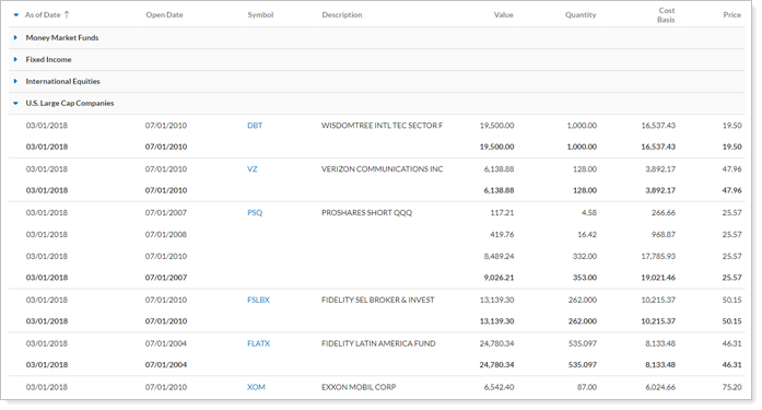 In this example, Amazon (AMZN) and Apple (AAPL) were added to the security group "All Legacy Holdings." The selected check box combines those securities into one line item.