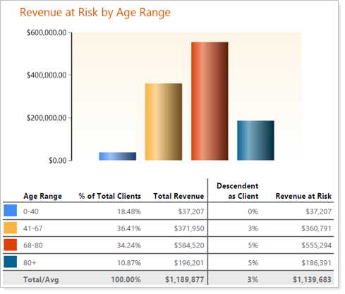This chart graphic is showing Revenue at Risk (Series/Y axis) by Age Range (Category/X axis). The chart breakdown is showing, by Age Range, the percentage of clients that fall into each range, as well as the total amount of revenue held in each. The Descendent as Client is a percentage of clients within the age range have descendants who are clients (if Family field value not empty). The Revenue at Risk calculation the Total Revenue minus the individual Total Revenue for those Accounts that have Family field filled in. The Total/Avg row is the total for each column, with the Descendent as Client column being an average.