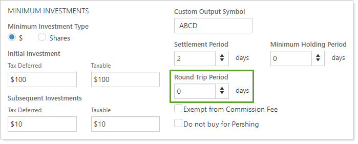 Round Trip Period lets you specify the number of days you'd like as a round trip for the selected security for the selected trade file group. The round trip period restriction prevents a buy after a sell for the number of days you specify. This allows you to limit round trip trading as set by policies from custodians and fund companies.