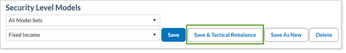 The Save & Tactical Rebalance button on the Security Level Models page lets you perform a Tactical Rebalance within the selected model rather than selecting accounts before performing this rebalance. A tactical rebalance is a model-specific rebalance for that model and any submodels underneath it, if performed on an Allocation model. This allows you to rebalance specific asset classes or sectors without completing a rebalance on an entire portfolio.