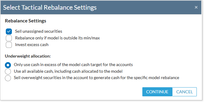 Invest excess cash. When selected, this option causes excess cash in the account—for example, cash generated from selling securities within the rebalanced model or excess cash not allocated to a model or cash reserves—to be allocated towards buying underweight securities in all models within the accounts selected.