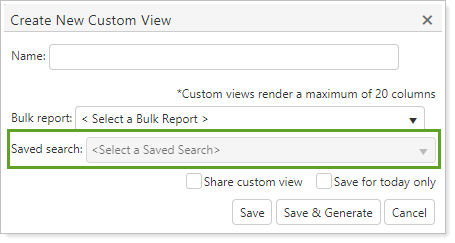Use this custom view setting to further filter the view using an existing saved search. This is optional. Only accounts, groups, Households, or securities that meet the criteria of the saved search will appear on the custom view. For more information on creating saved searches, visit Saved Searches.