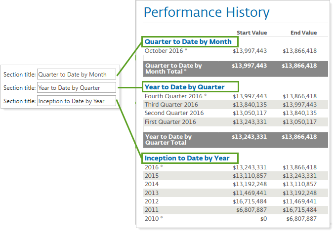 For example, a user has created a Performance History report that includes all the intervals, but they want to be more specific about what the date ranges mean. The user renames the section titles: