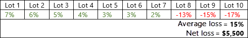 For example, a client's tax loss harvesting thresholds are 15% and $5,000. The client has a security with 10 lots. Seven of those lots have gains and three have losses, and the average loss and net loss surpass the account thresholds: