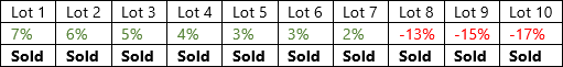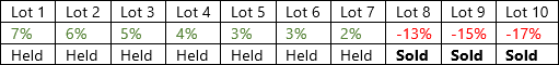 With the Sell only losses option selected, when you perform a Tax Loss Harvesting rebalance, only the three lots with losses will be sold. The losses on the individual lots do not need to meet the loss threshold, only the average of losses for the security:
