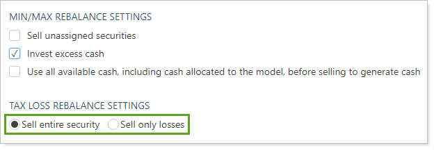 This setting only applies to the tax loss harvesting rebalance types: Tax Loss Harvesting & Rebalance and Tax Loss Harvesting Rebalance.