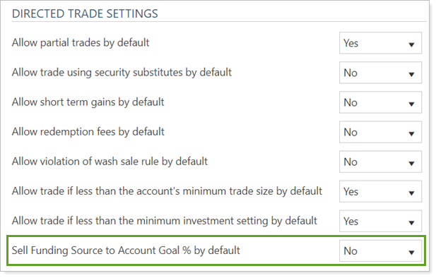 The Sell Funding Source to Account Goal % by default system setting allows you to set the default behavior for Only Sell to Account Goal % whenever you create a Buy directed trade.
