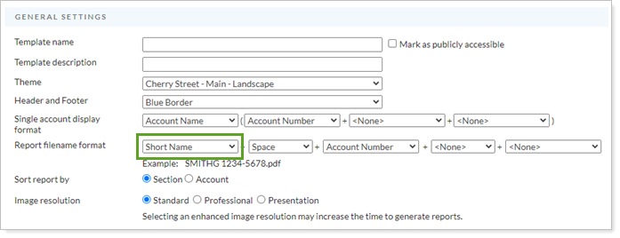 You can choose to use Short Name in the automatically generated PDF report file name. Since the field is open, you can use this to create PDF file names that adhere to your firm naming conventions.