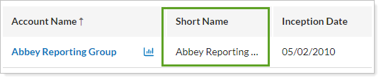 Available as a column on the Accounts page. In addition, when searching on the Accounts page, Short Name values will appear in your results.