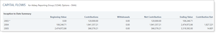 This setting allows you to display or hide the Account Value vs. Net Investment chart on the Capital Flows report. The chart shows net contributions compared with the account value, which allows you to clearly see the investment gain.