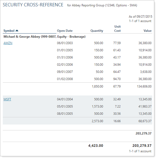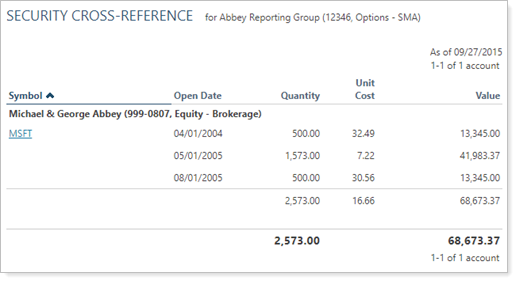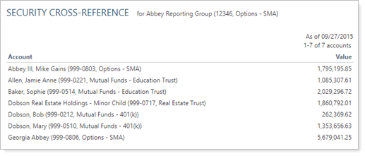 For example, you set a report to show accounts holding any of securities: MSFT. In this example, only one account in the Abbey Reporting Group holds MSFT. Only the MSFT holdings in that account is displayed, while the other holdings and accounts are filtered out.