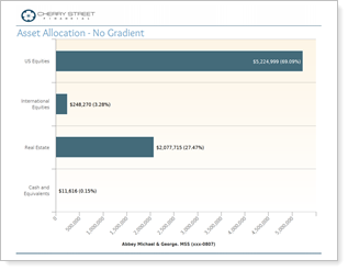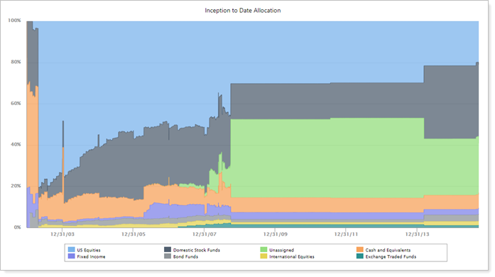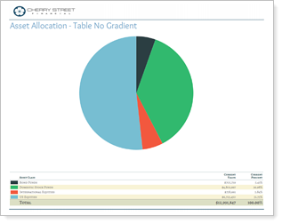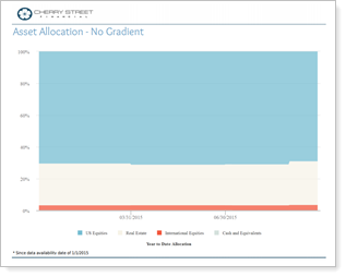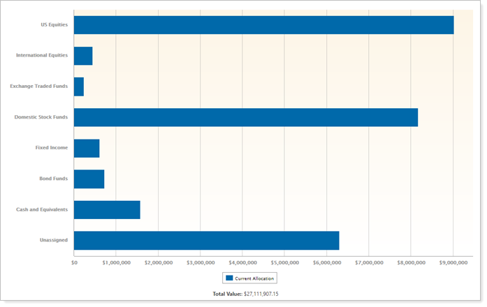 Moment-in-time snapshot emphasizes amount of holdings in each grouping. This is an especially useful chart when comparing current allocation to target allocation. |