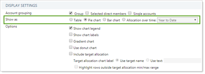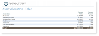 | At-a-glance visual breakdown of the moment-in-time holdings within the account or group. Includes a summary table. | |