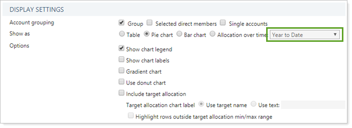 This setting allows you to display the data on the Asset Allocation report color-coded chart that represents the proportion of each category held at a specific time.