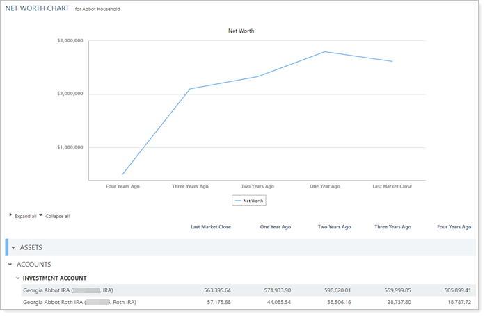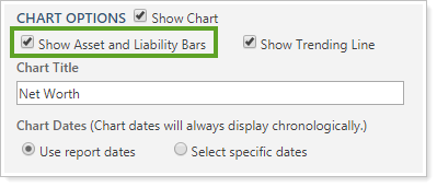Use this Net Worth report setting to add bars to the chart in the report. One data bar is added for each date. Control the color scheme of the dynamic chart in the Site Theme under Color Options and the PDF chart in PDF Themes.