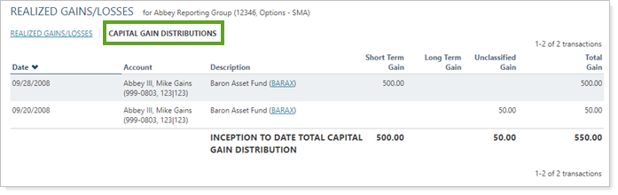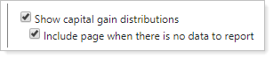 Because capital gains are taxed at a different rate than realized gains/losses from the sale of holdings, you may want to display them elsewhere or not display them at all. This setting allows you to determine how these types of distributions are displayed on each report.