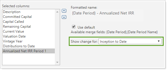For example, you want to add IRR as a column to the Committed Capital report. However, the IRR calculation uses a date range, rather than a single point in time. This report setting allows you to set the date period for IRR columns even though Committed Capital is based on a single date.