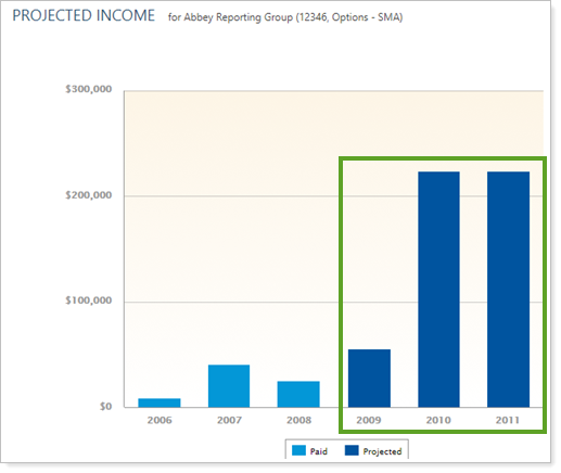 On the Projected Income report, you can choose to show or hide a summary bar chart. The decision to do so depends on what you're trying to achieve with the report. The bar chart can provide a helpful visual summary of received and projected income, but may not be helpful for detailed income analyses.