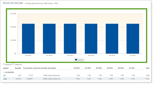 A bar chart with summarizing the projected income for each date period is displayed above the table.