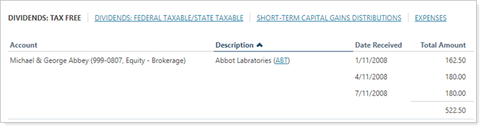 Cleared. In this example, income was received from security ABT on several dates. All those instances are rolled up into one line item on the report.