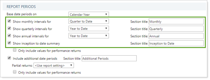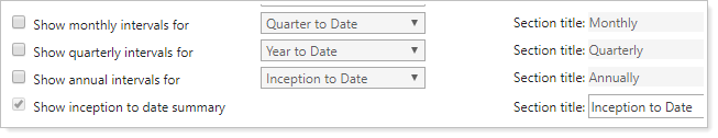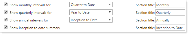 The Performance History report displays basic account activity and performance values for a variety of different intervals. These settings allow you to add specific intervals to the Performance History report. The following intervals are available: